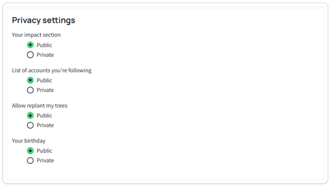 Update your name, privacy preferences, visibility settings, and more.Note: Other basic details (name and surname) can be added on your forest page. How? Click on your profile icon at the right top. Click ´Access my forest´. In the top banner you will find the ´Edit´ button.