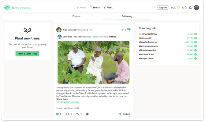 Clicking any hashtag throughout the platform redirects to the Hashtag Page (a filtered Tree Feed). On the right side, the trending hashtags are displayed. Using hashtags is a great way to inspire others with your tree-planting reason.
