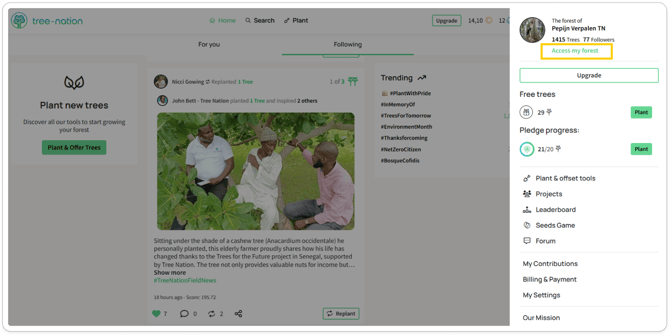Users logging in from the main login button are redirected to the Tree Feed. If you want to go back to your forest, click on your profile image at the top right and click on ´ Access my forest´.