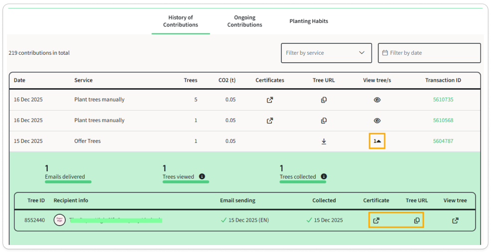 - Copy the tree gift and certificate link so you can share this with the recipient